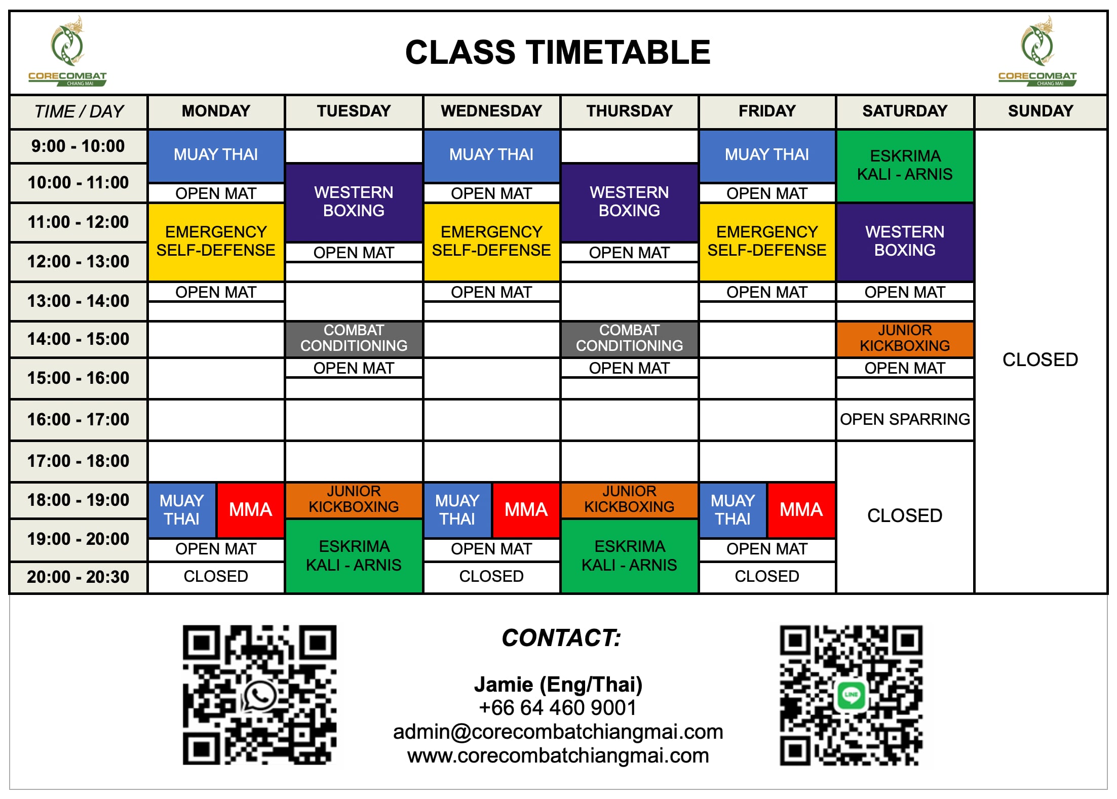 Check out our classes of Martial Arts, Muay Thai, Western Boxing, MMA, Eskrima, Emergency Self-Defense, Private Training and Jr Kickboxing classes, offered only at Core Combat Chiang Mai. Schedule your first lesson with us today!